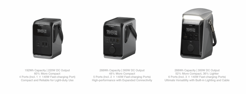 - Capacité et puissance : Les trois modèles offrent une capacité de 288 Wh et une puissance de sortie allant jusqu’à 300 W en courant continu pur. C’est suffisant pour alimenter une grande variété d’appareils essentiels : glacières électriques, éclairages, caméras, routeurs, radios, et plus encore.