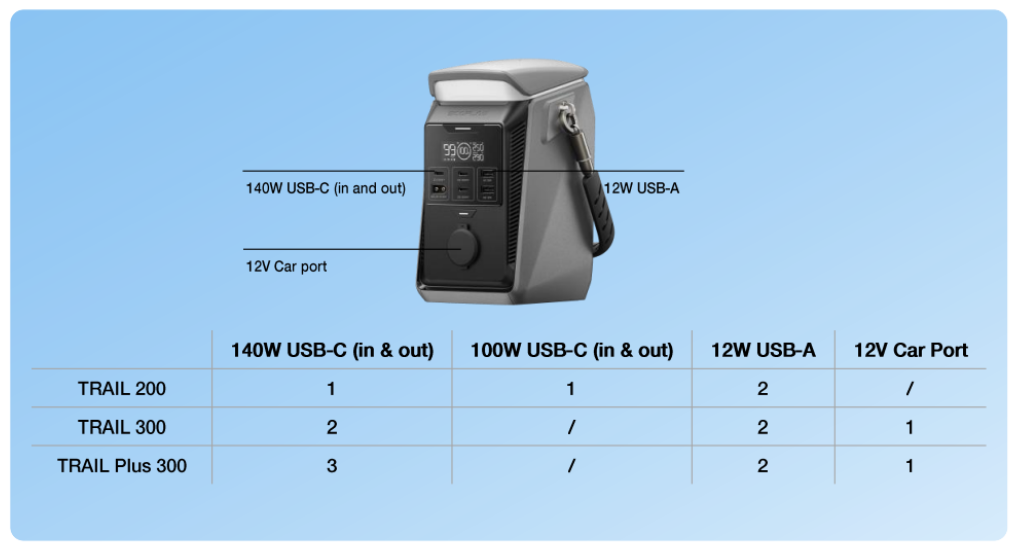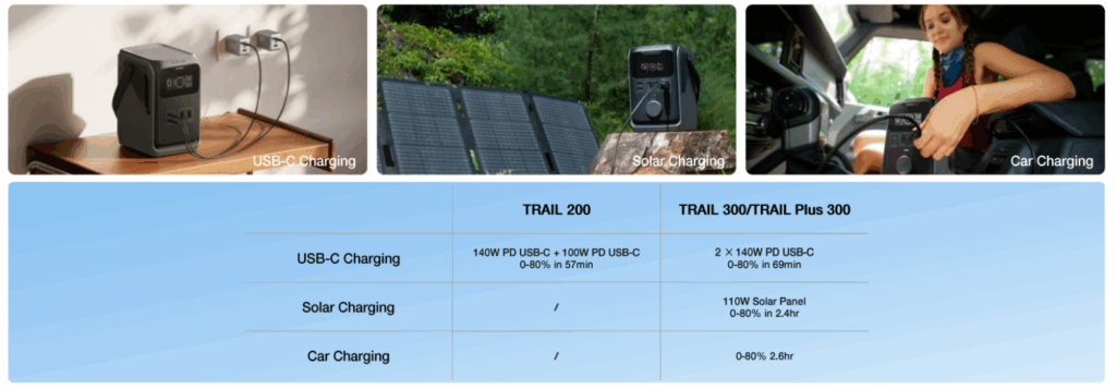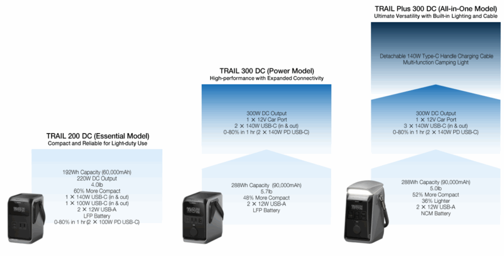 - TRAIL Plus 300 DC : La version la plus performante, dotée de ports supplémentaires et d’une charge plus rapide pour les utilisateurs les plus exigeants.