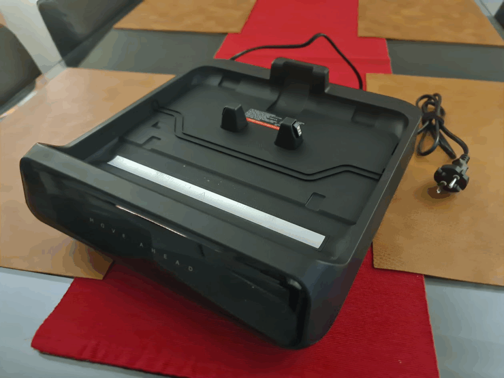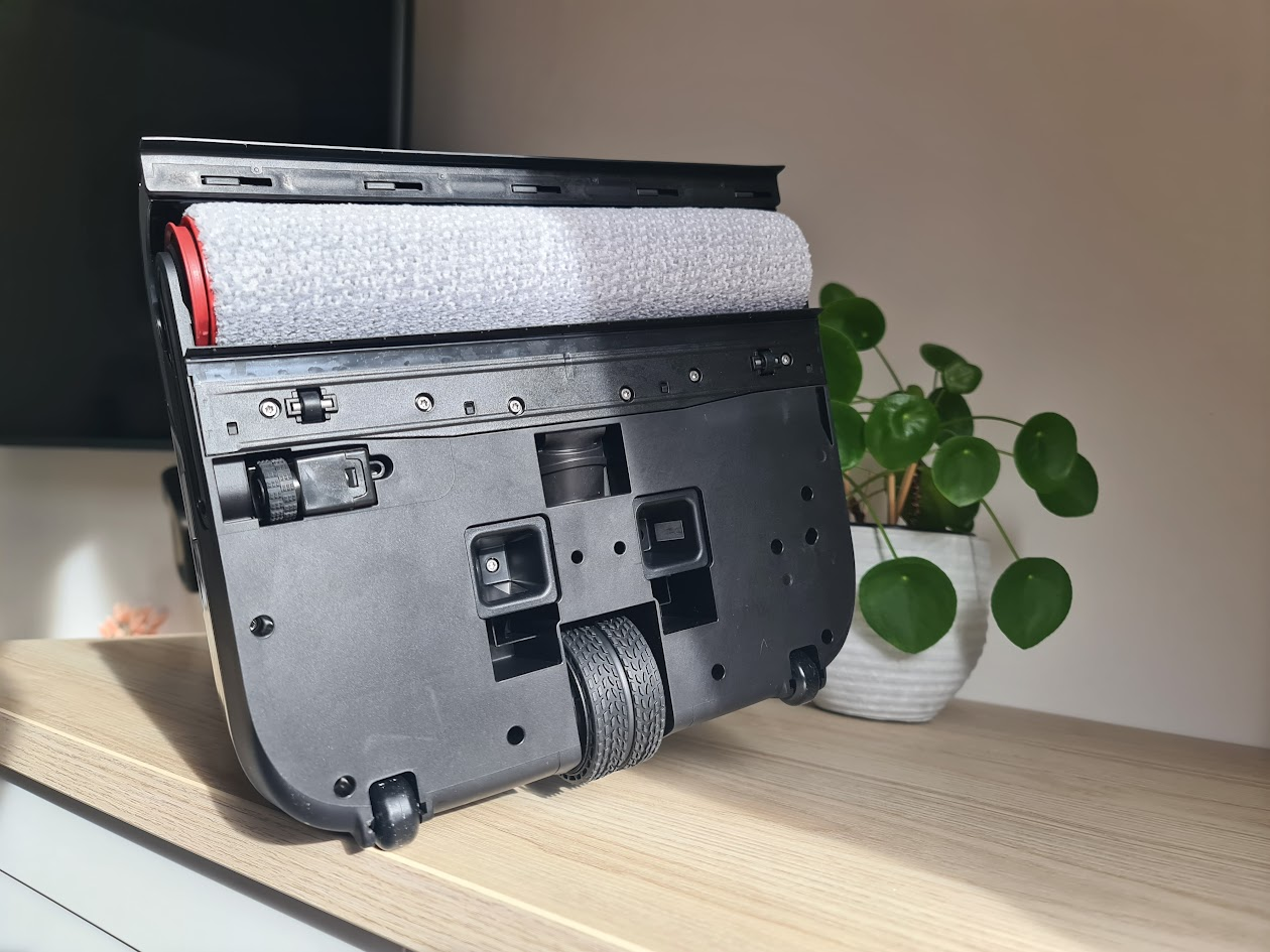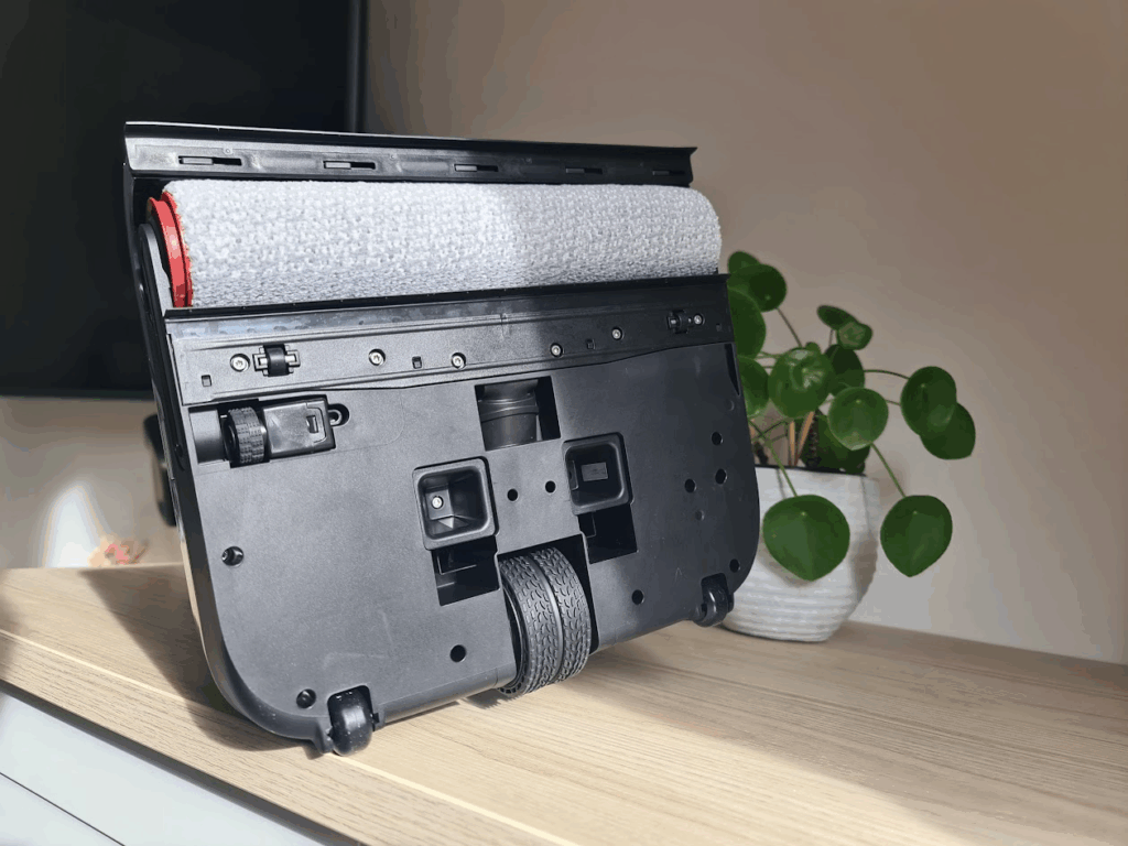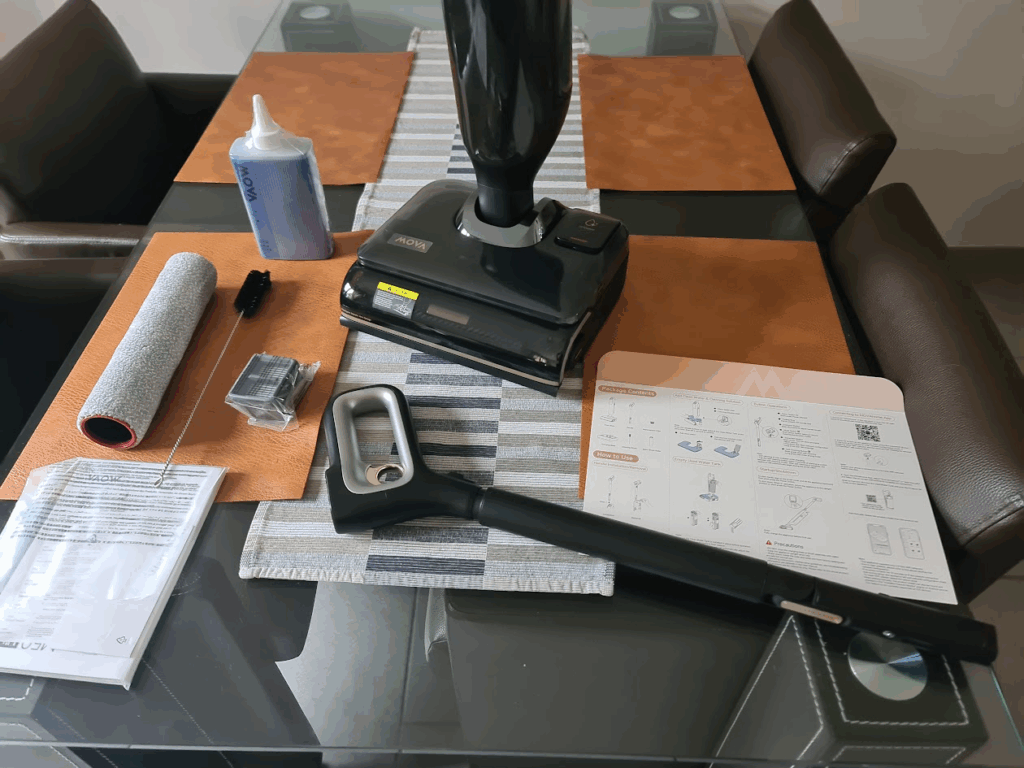 Dès la réception du colis, on sent que Mova a soigné son produit. La boîte est bien conçue, et chaque élément est emballé avec soin. À l’intérieur, on trouve le balai principal, le manche à enficher, sa base de chargement, les deux réservoirs (eau propre et eau sale), le rouleau-brosse et un flacon de solution de nettoyage.