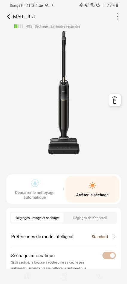 C’est ici que l’appareil révèle son côté ultra-intelligent. Après avoir terminé votre session de nettoyage, vous n’avez qu’à remettre le M50 Ultra sur sa base. Il lance alors un cycle d’auto-nettoyage du rouleau-brosse et des tuyaux à l’eau chaude, atteignant la température impressionnante de 100°C. Ce processus non seulement élimine les saletés les plus tenaces, mais il tue également les bactéries et les germes, et surtout, il empêche l’apparition des mauvaises odeurs, un problème récurrent avec les appareils de ce type.