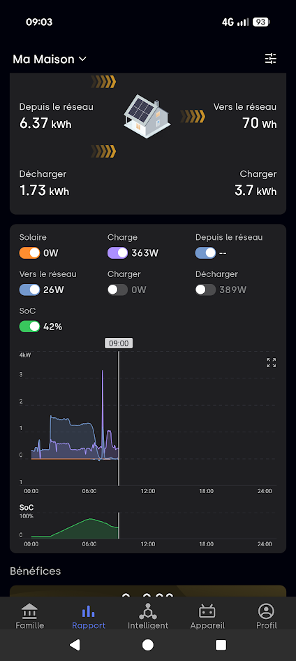 Le Miracle de l’Optimisation : La batterie et le Smart Meter communiquent en temps réel. Si la maison produit trop (surproduction), la batterie capte l’excédent. Si la maison consomme sur EDF, la batterie se décharge pour combler juste au Watt près le besoin. Dans le test, la mesure du Smart Meter reste à 0 W, car tout le surplus est immédiatement dirigé vers la batterie.