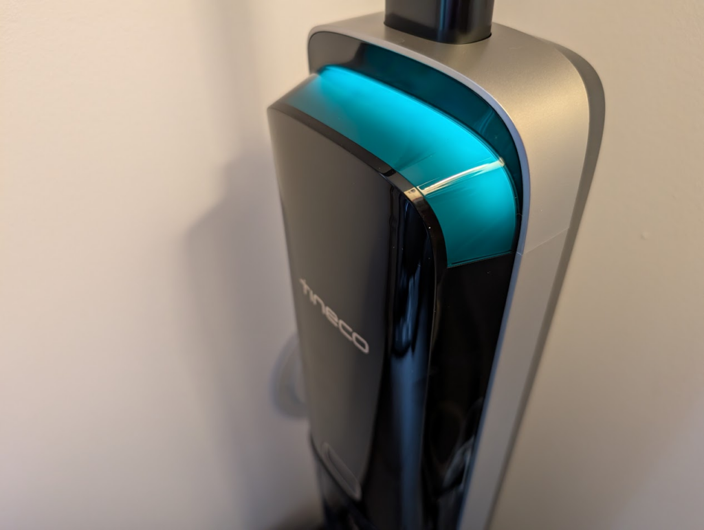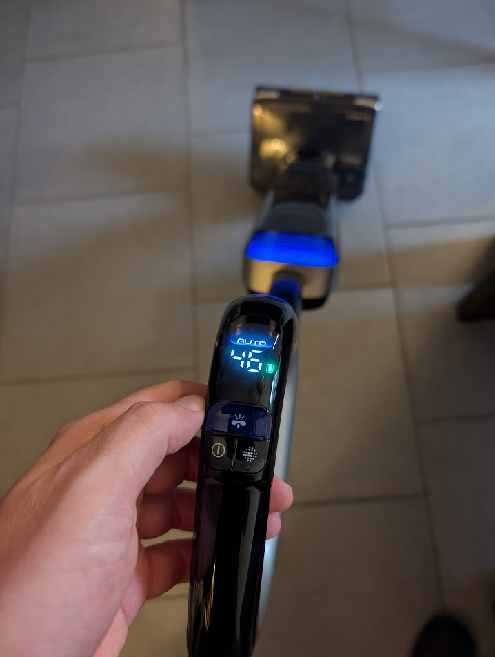 Le capteur iLoop, signature de Tineco, est évidemment de la partie. Ce capteur infrarouge détecte le niveau de saleté au sol en temps réel et ajuste automatiquement la puissance d’aspiration ainsi que le débit d’eau. On voit l’anneau sur l’écran LED passer du bleu au rouge dès qu’une zone est particulièrement sale. C’est non seulement satisfaisant visuellement, mais cela permet surtout d’optimiser l’autonomie de la batterie et de l’eau.