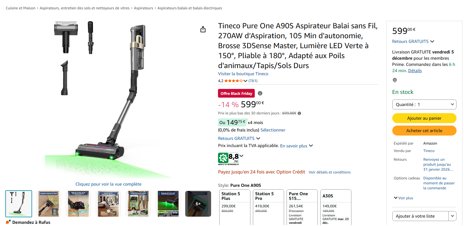 Retrouvez ce A90S sur la boutique officielle Tineco ou sur leur store Amazon.