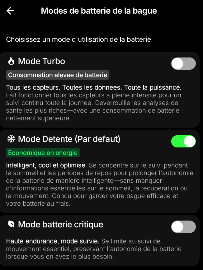 - Le Mode Chill : j’ai fini par basculer sur ce mode. Il espace légèrement certaines mesures non critiques sans pour autant sacrifier la qualité globale du suivi. Et là, miracle : la bague tient environ une semaine