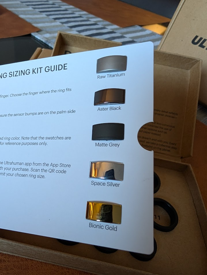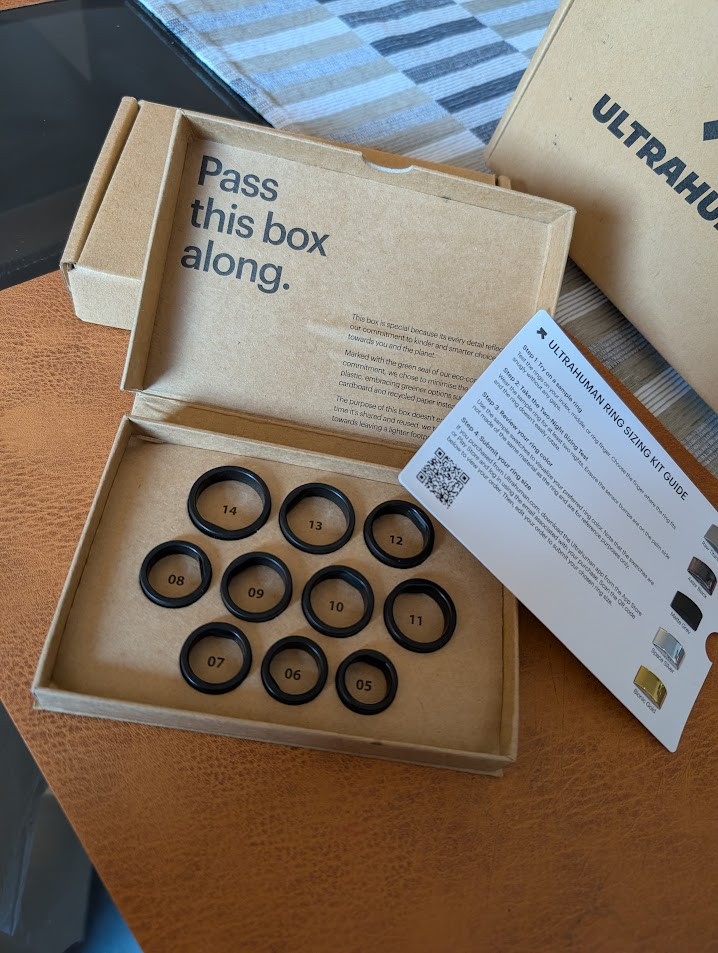 Avant même d’avoir la bague, l’expérience commence par le Sizing Kit. C’est une étape cruciale : une bague trop serrée est insupportable, trop large et les capteurs perdent le fil.