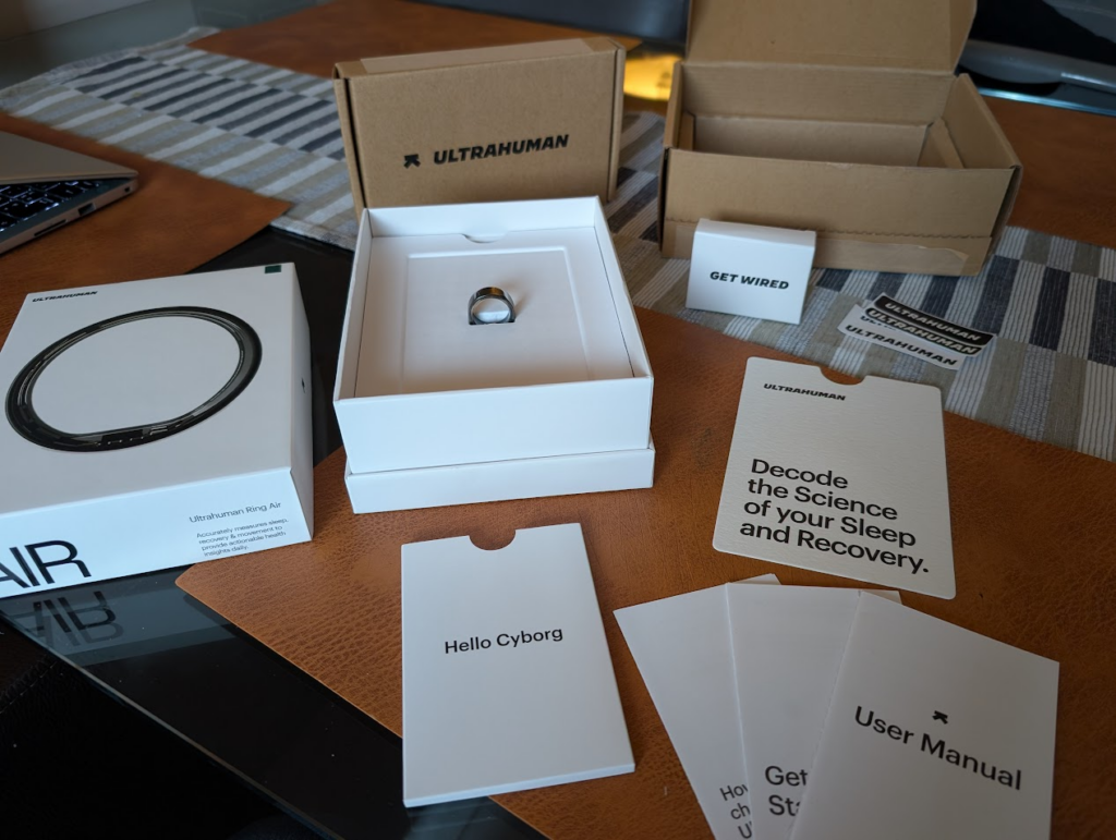 Ultrahuman vous envoie une boîte avec des répliques en plastique de toutes les tailles. Mon conseil ? Portez la bague de test au moins 24h, car vos doigts gonflent avec la chaleur ou l’effort. Dans le sizing kit, vous trouverez également un aperçu des coloris, de quoi se sentir rassuré avant de faire son choix final ! Une fois votre taille validée sur leur site, la « vraie » bague arrive dans un emballage ultra-soigné. On sent tout de suite qu’on est sur un produit premium.